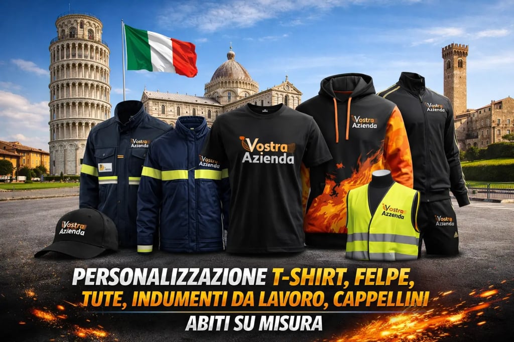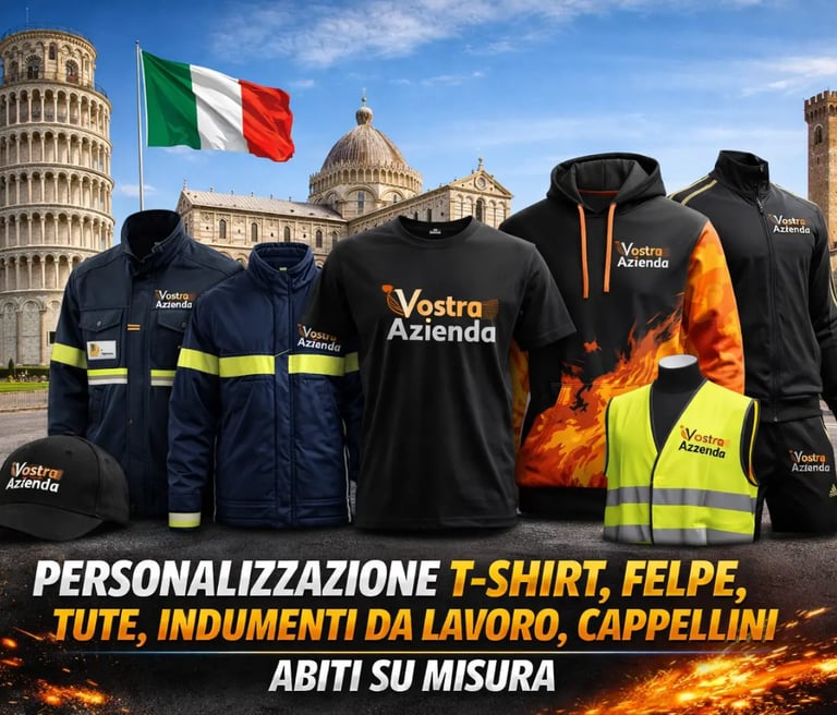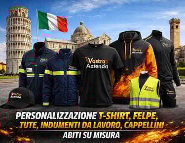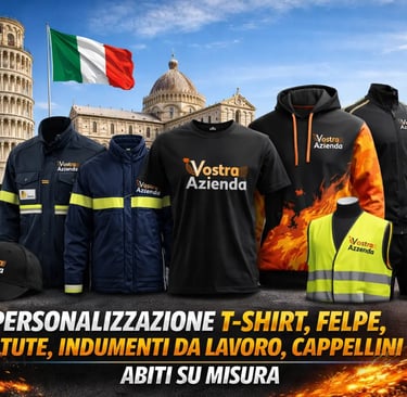 Stampa magliette e abbigliamento personalizzato a Pisa. Realizziamo t-shirt, felpe e divise da lavoro con logo per aziende, associazioni e privati in Toscana.